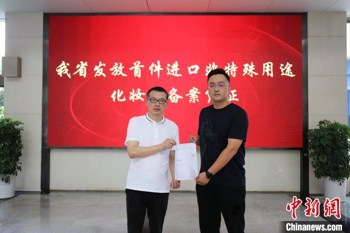 6月2日,湖南省药监局党组书记梁毅恒(左)在长沙向企业颁发了湖南省首件进口非特殊用途化妆品备案凭证。湖南省药监局供图