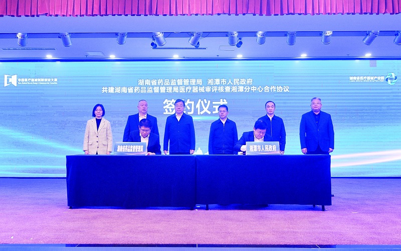 2024年11月22日,湖南省药监局与湘潭市人民政府签署共建湖南省药监局医疗器械审评核查湘潭分中心合作协议。图为签约仪式现场。 罗韬 摄