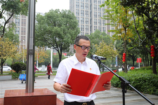升旗仪式上,梁毅恒书记代表局党组作了作了振奋人心的致辞,肯定了省药品监管局一年来取得的成绩。他要求,全体干部职工要更加紧密地团结在以习近平同志为核心的党中央周围,坚决与以习近平同志为核心的党中央保持高度一致,用习近平新时代中国特色社会主义思想武装头脑,贯彻落实习近平总书记考察湖南时的重要讲话精神,闯出新路子,展现新作为;要坚持以党的建设为引领,始终牢记、扎实践行誓言,将爱国情、报国志转化为爱岗敬业的热情、开拓创新的锐气、真抓实干的行动,用心用情、尽职尽责,落实习近平总书记“四个最严”要求,确保人民用药安全;要坚持党要管党、全面从严治党,认真贯彻新时代党的建设总要求,始终保持为民务实清廉的政治本色,不断锤炼忠诚干净担当的政治品格,锻造一支政治坚定、作风优良、业务精湛的高素质药监干部队伍。