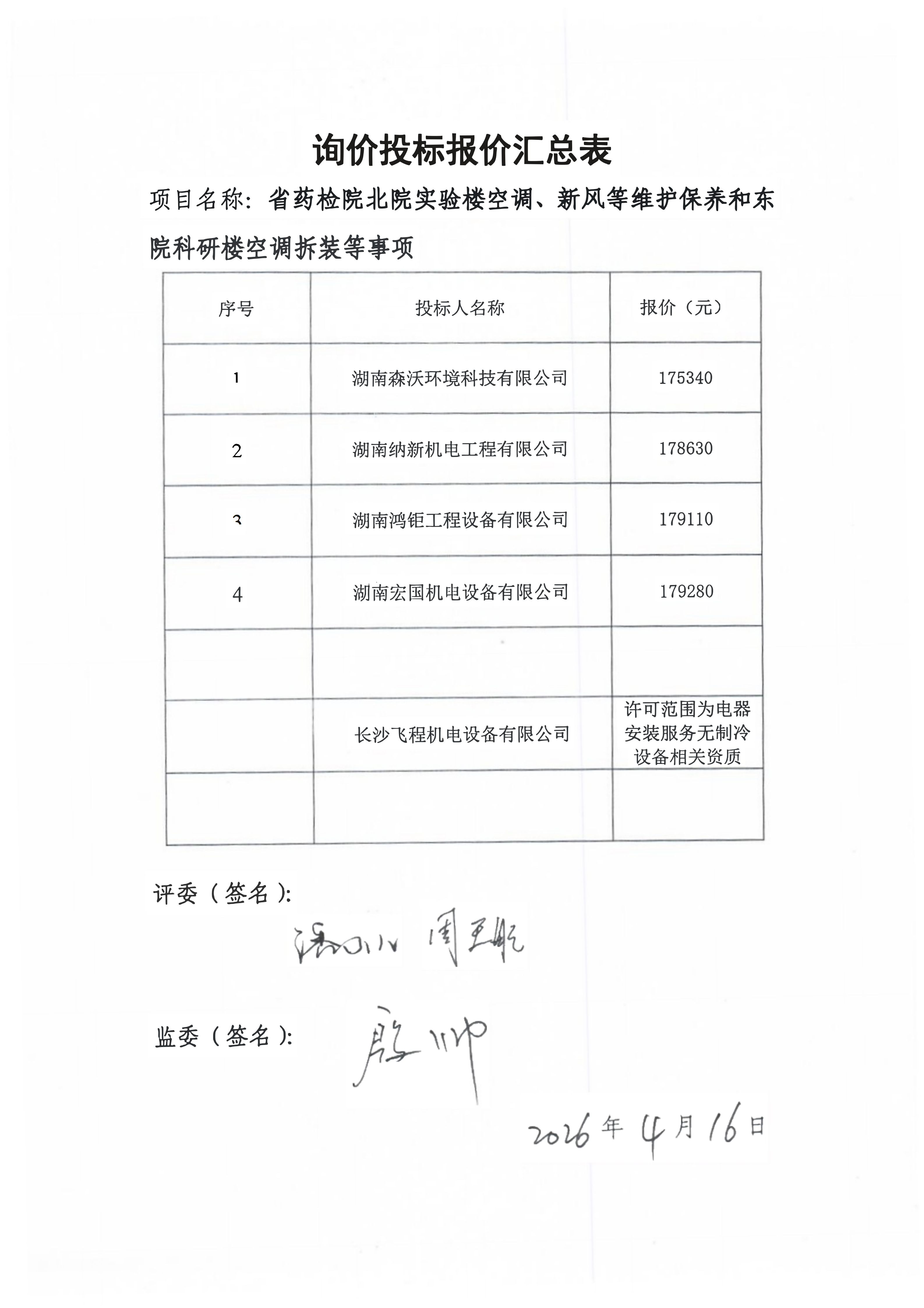 省药检院北院实验楼空调、 新风等维护保养和东院科研楼空调拆装询价投标报价汇总表
