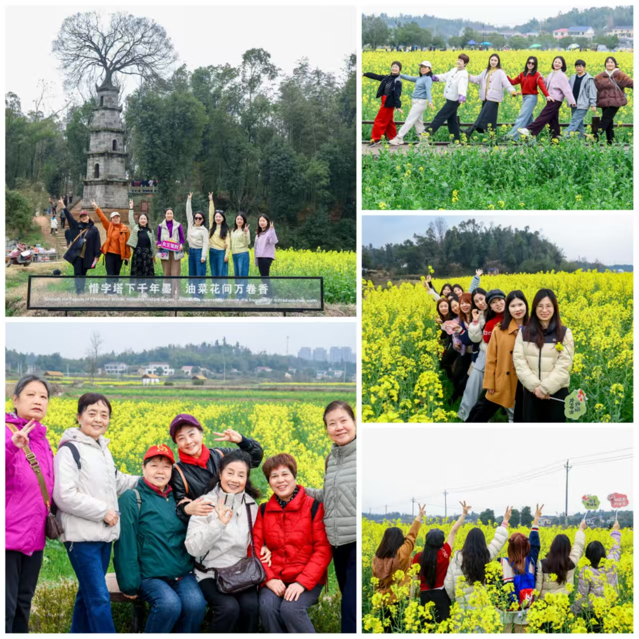 作为望城赏花“顶流”,茶亭花海宛如一片“金色海洋”,花海旁,百年惜字塔静静矗立,塔顶“塔树共生”的自然奇景与春日生机相映成趣,古朴建筑与烂漫花海构成独具韵味的田园图景,女职工们漫步花海,以镜头定格春日美好,用光影记录巾帼风采。