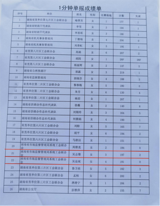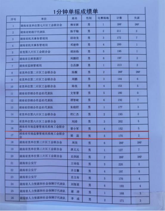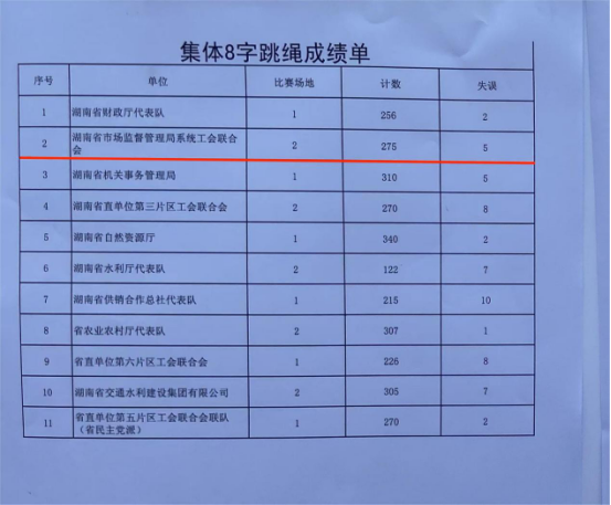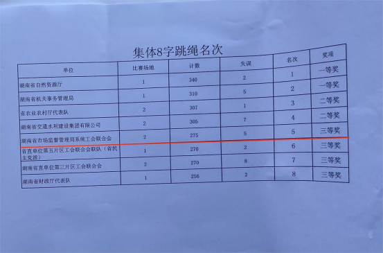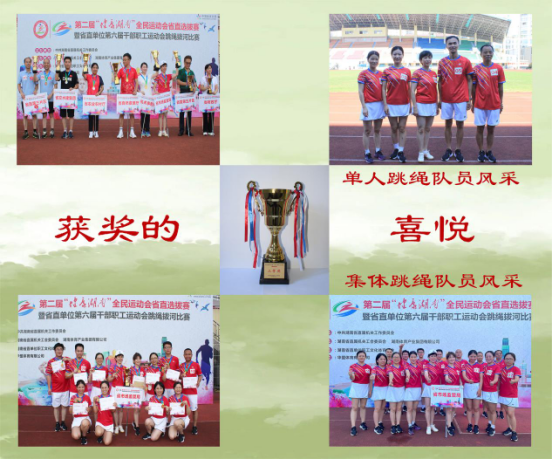 中心工会根据省市场监督管理局系统工会联合会转发的《关于选拔参加省直单位第六届干部职工运动会队伍的通知》要求,积极组建跳绳参赛队队,并经系统工会联合会在众多跳绳参赛队伍中严格筛选,获得牵头承担跳绳大项参赛权。中心工会考虑到集体跳绳队为便于集中练习,全部由中心职工参与,单人跳绳则在局直系统各单位广泛征集意愿报名,立即按要求组建了来自省药审中心、省药检院、省质标院及国家知识产权局长沙中心等四个单位、由17人组成的跳绳参赛队伍,分别参加集体长绳3分钟绕8“字”跳、女子个人1分钟单摇跳和男子个人1分钟单摇跳三项比赛。各位参赛队员克服业务工作繁忙、家庭琐事繁多等艰难困苦,在未请专业教练指导的前提下,备战高温酷暑,经过近二个月的艰苦训练,于7月11日冒着炎炎烈日,在湖南省体育场拉下比赛帷幕,选手们不畏强手如林、奋勇争先、顽强拼搏,赛场上个个健步如飞、“绳”采飞扬,经激烈角逐最终取得了优异成绩,集体跳绳荣获三等奖(即第五名:三等奖里排名第一),单人跳绳项目,因参赛人数众多,高手云集,获奖比例太低,虽然没有获奖,但是选手们赛出了水平、赛出了风格。充分展示了市场监管人的靓丽风采,为市场监管系统赢得了荣誉、增添了光彩,可喜可贺。